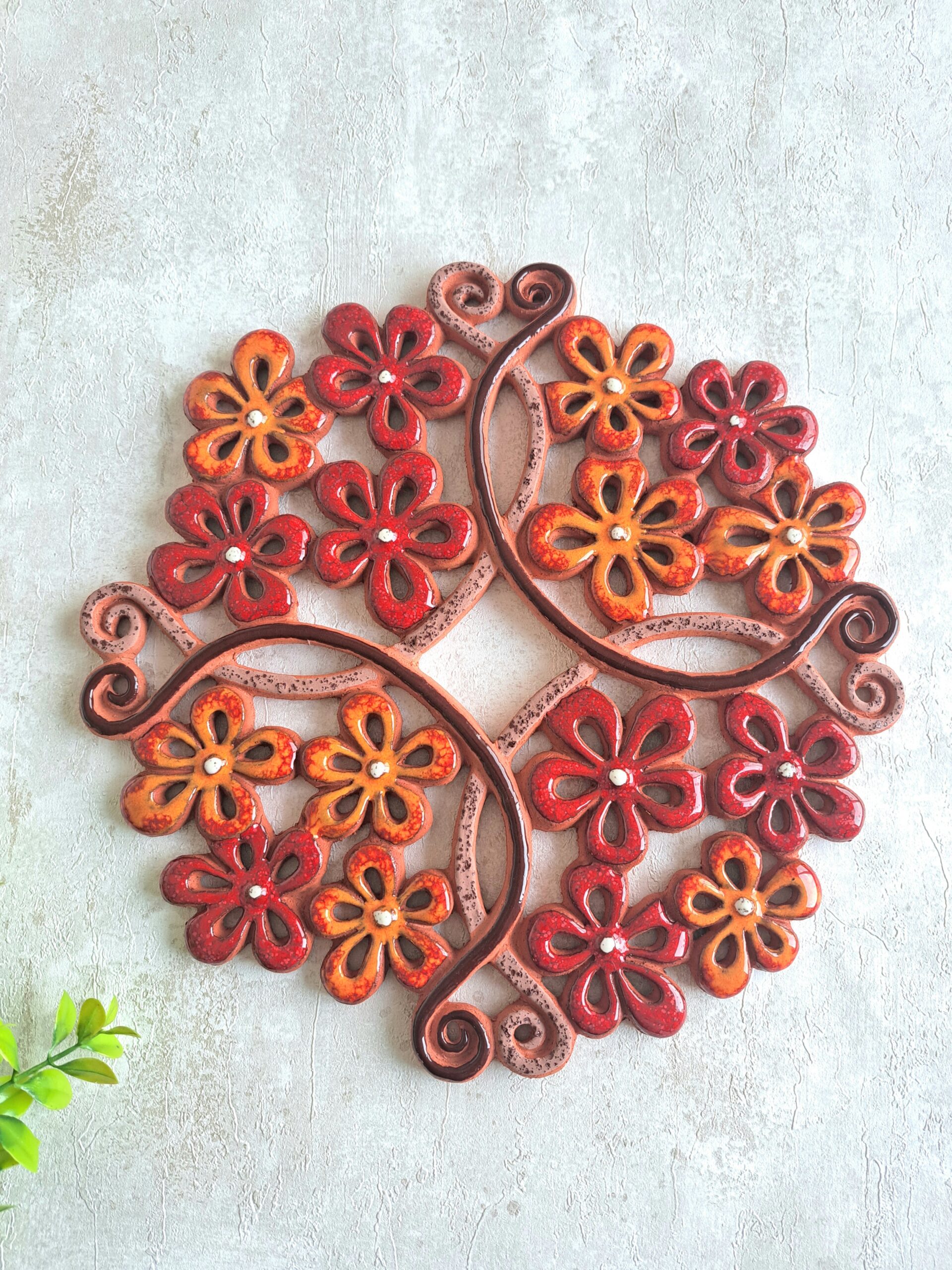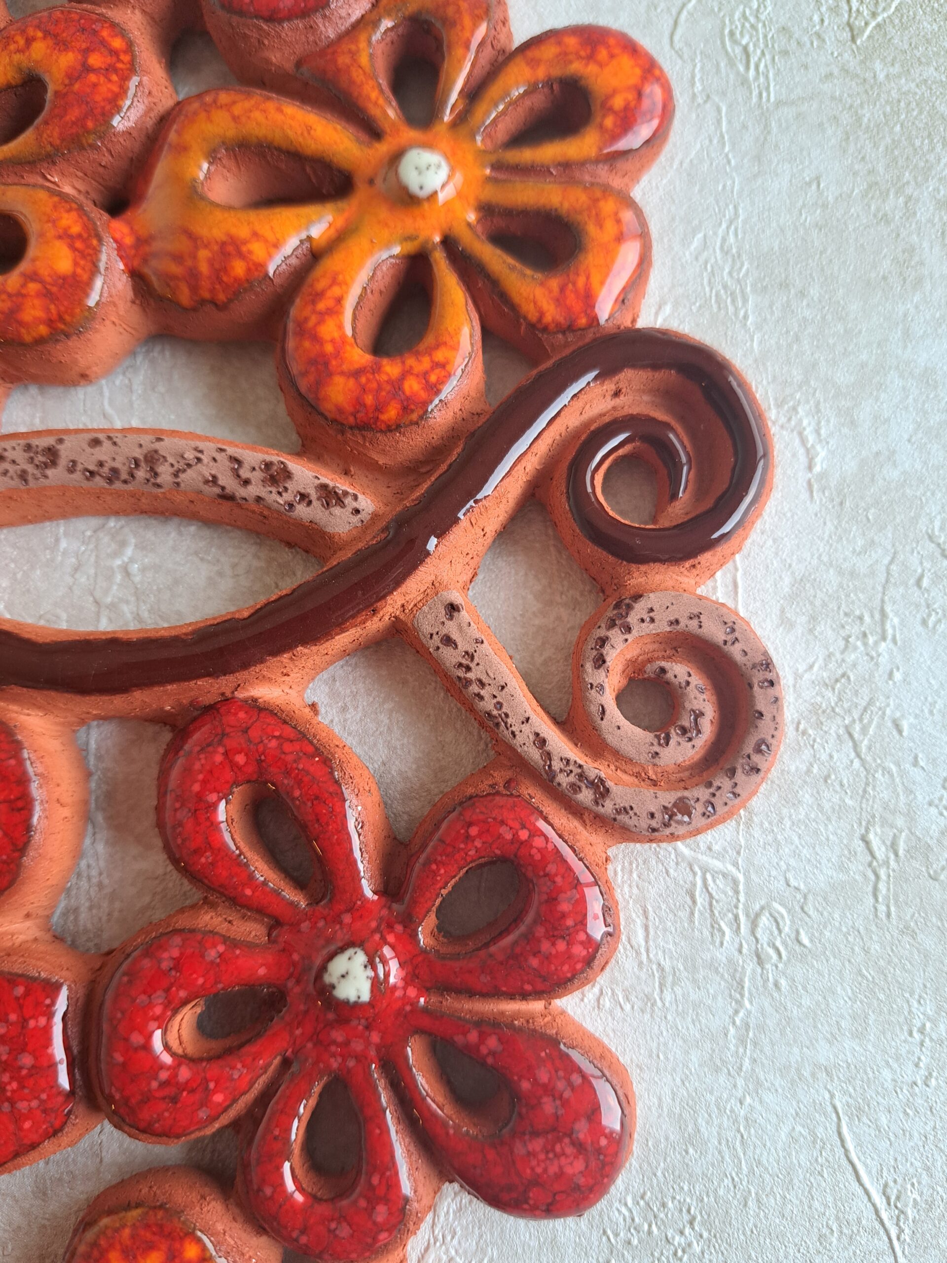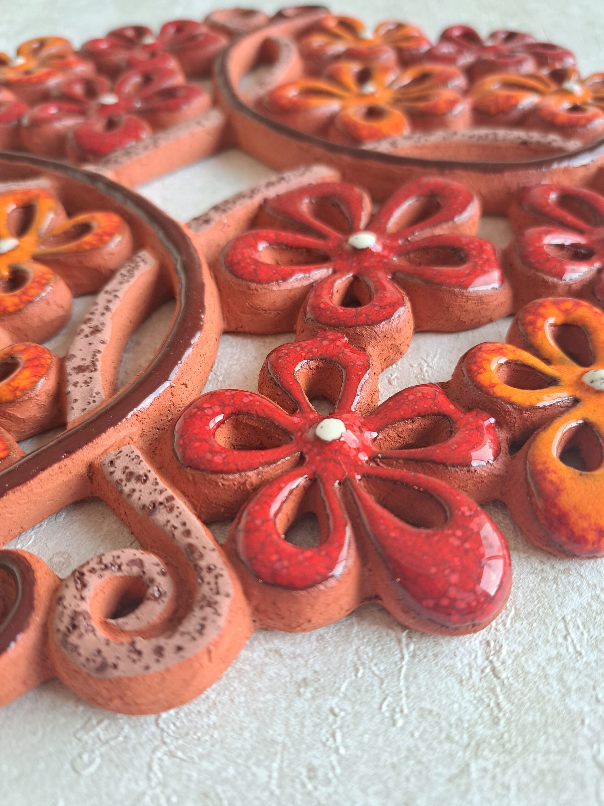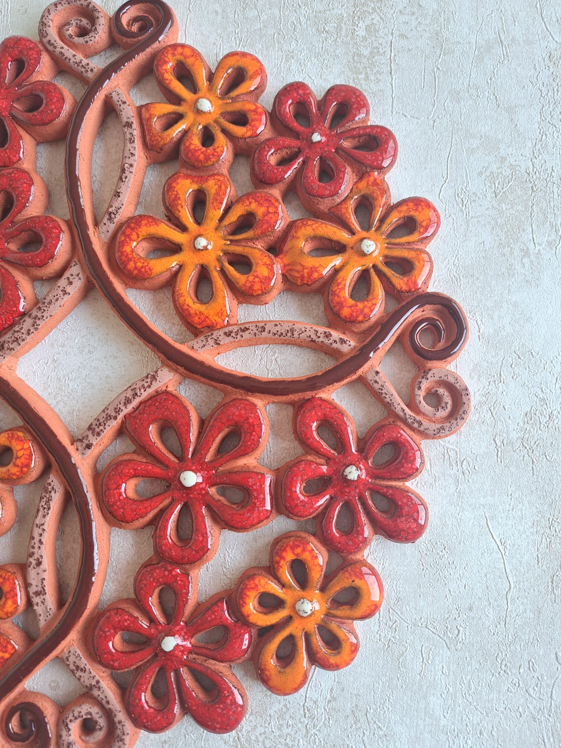 Mandala em cerâmica, modelada manualmente, com desenho autoral. Durante o seu processo de criação passou por duas queimas à 1.100 °C. Suas flores foram recortadas na argila para que apresente uma delicadeza e leveza em seu estilo. Possui 28 cm de diâmetro.