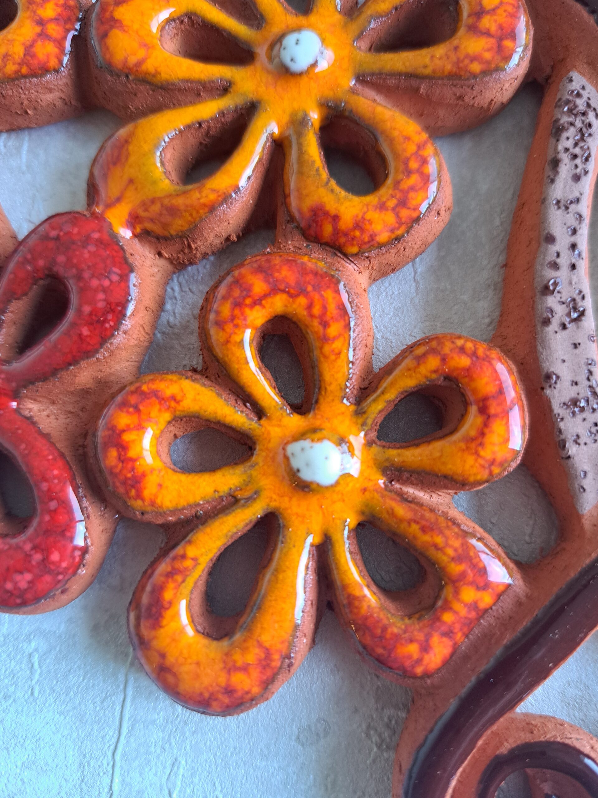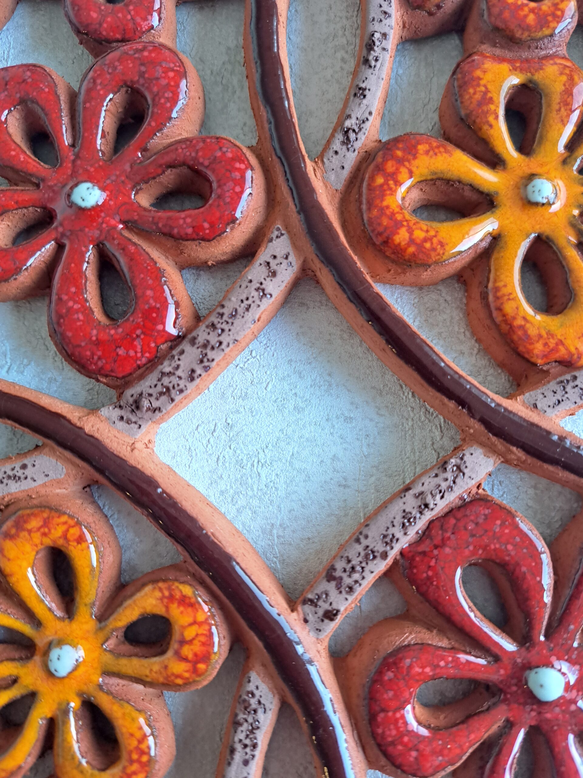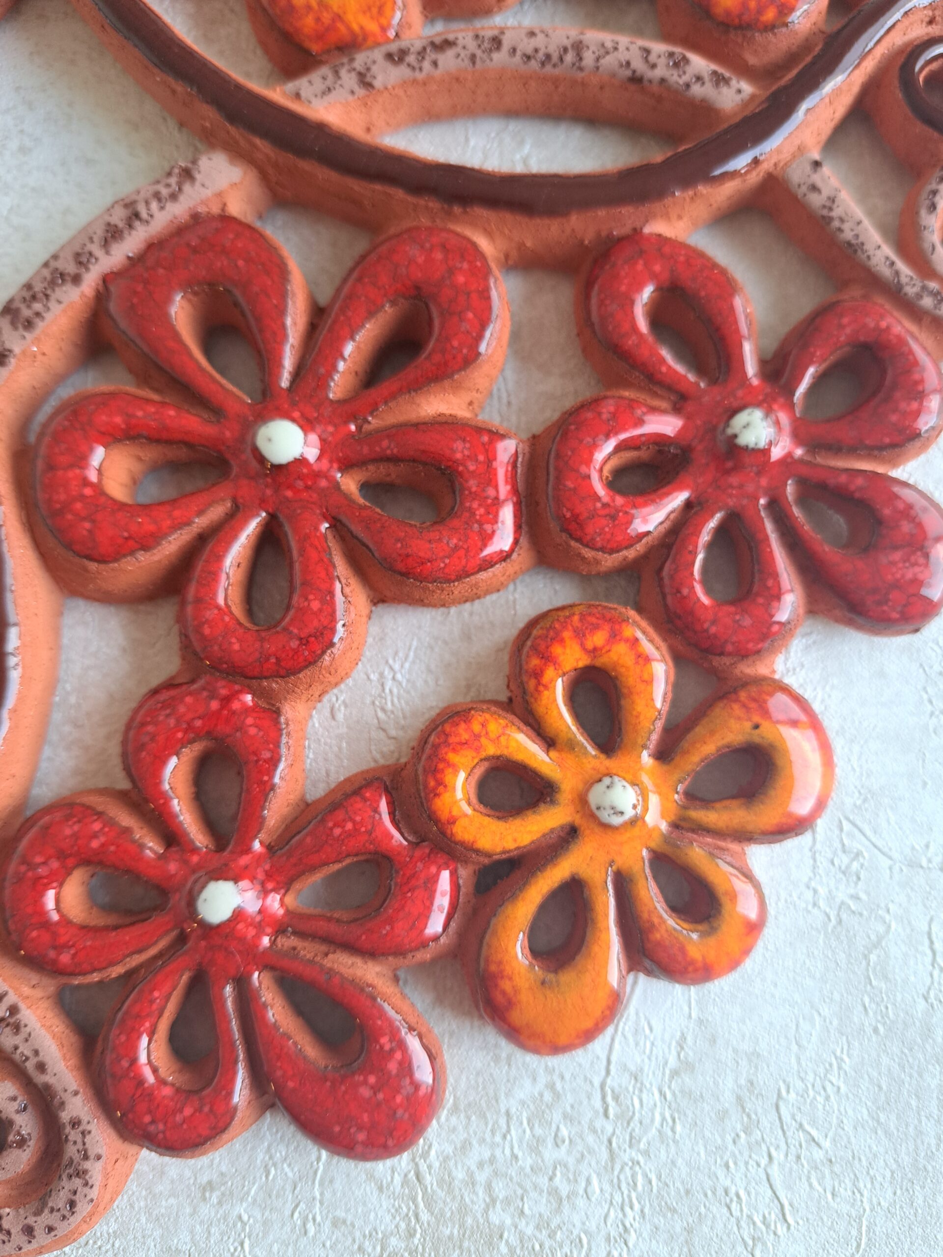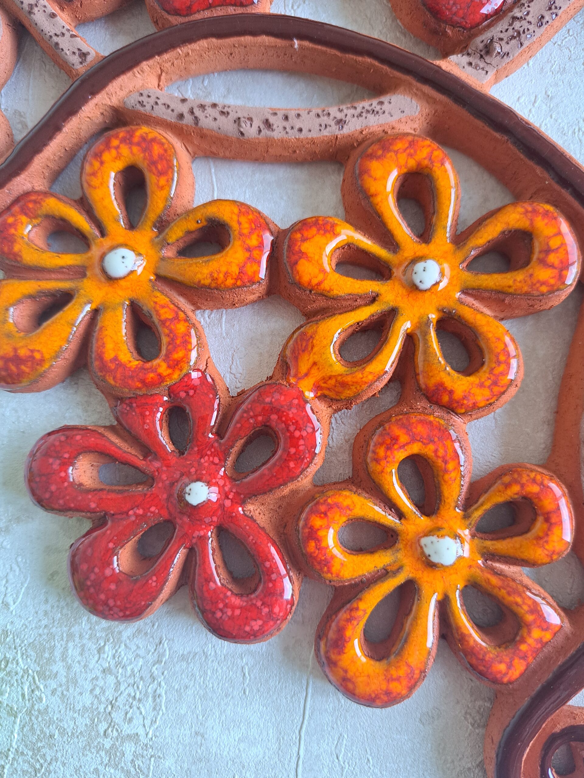 Mandala em cerâmica, modelada manualmente, com desenho autoral. Durante o seu processo de criação passou por duas queimas à 1.100 °C. Suas flores foram recortadas na argila para que apresente uma delicadeza e leveza em seu estilo. Possui 28 cm de diâmetro.